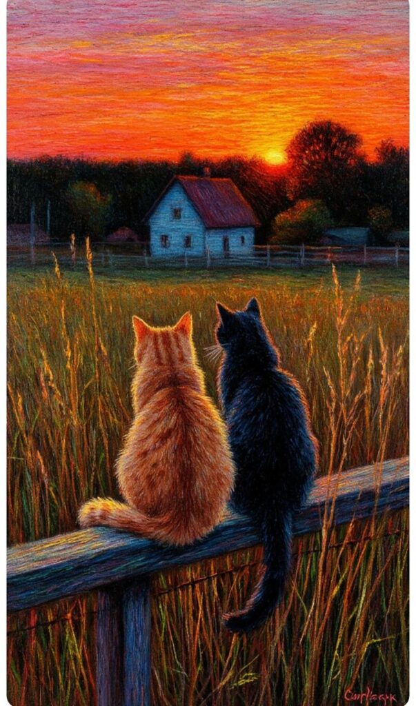 A macskás tájkép ötvözi a természet nyugalmát az állatos témák érzelmi erejével. A macska motívum játékosságot és személyességet ad a kompozíciónak.